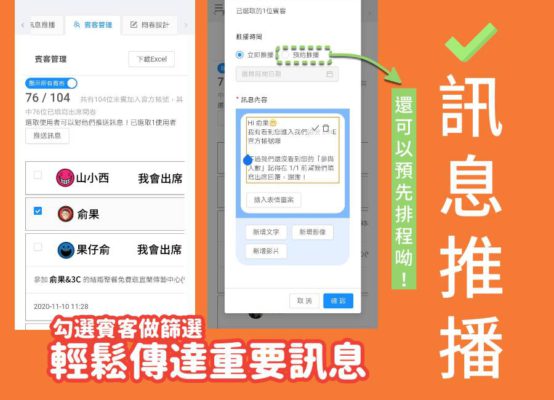 拍拍印後台的訊息推播強大的是它可以「勾選賓客」,挑出對象傳訊息,這樣就不會打擾到其他人了~ 而且訊息是可以預先安排好的!所有操作都在拍拍印網頁管理後台,介面非常簡單明瞭。