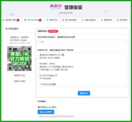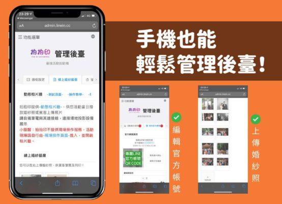 要如何從管理後臺修改客製化的 LINE 官方帳號內容呢?拍拍印會提供一個「專屬」的後臺網址,免登入、免帳號密碼,只要有專屬後臺網址就可以修改自行調整所有內容。( 所以說不要弄錯,把後臺網址給來賓阿~沒人會這麼呆吧 XD )