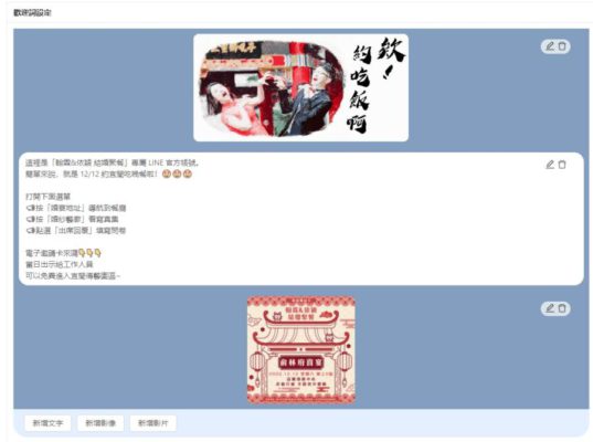 在「我的官方帳號」這個頁籤,我們可以設定賓客加入 LINE 官方帳號會收到什麼訊息。我喜歡視覺衝突,所以設定第一個彈出來的訊息就是一張非常吸睛的照片邀請卡 XD 除了圖片,當然還可以傳送文字、影片到 LINE 官方帳號。想讓賓客在 LINE 上面看什麼內容,全部都可自由設定。