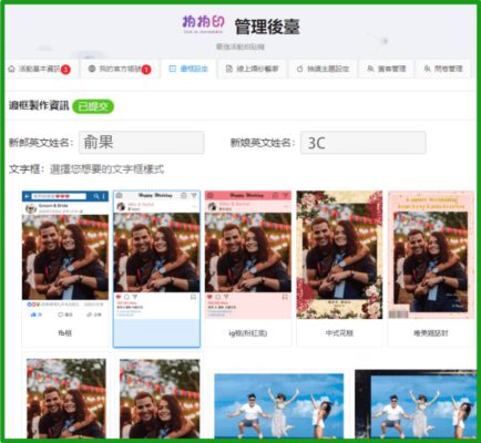 上面兩張畫面是拍拍印管理後臺「邊框設定」功能,沒錯!這其實才是拍拍印的老本行「相片拍立得」功能啦!拍拍印提供十幾種不同邊框,總共可以選出四種,賓客每洗一張照片,就是套用我們選擇的四種之一。