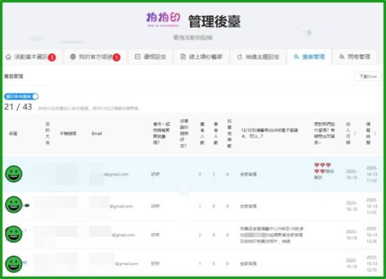 你用 Google 問卷 或 SurveyCake 作為賓客出席回覆問卷嗎?用拍拍印比較讚啦!拍拍印把出席回覆直接嵌在電子喜帖裡啦,我們從後管理後台就可以看到每個人的回覆,左上角直接顯示目前有 43 位在官方帳號裡,其中有 21 位已經填了回覆,右邊則有匯出 EXCEL 的功能鍵,非常方便!最棒的是填寫時直接綁定 LINE 大頭貼,一看圖片就能夠立即辨識,有時候還會看到爸媽的朋友,雖然不認識~但又是另一種樂趣。