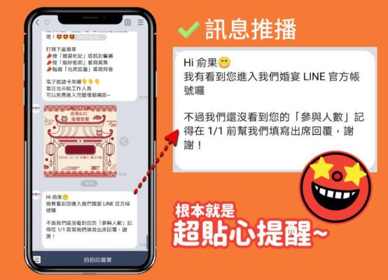 用 LINE 官方帳號宣布喜訊真的非常方便,拍拍印後台管理還提供「訊息推播」服務,讓加入官方帳號的親友能夠收到我們想通知的其他消息。像是提醒他們要記得填寫出席回覆,非常人性化。