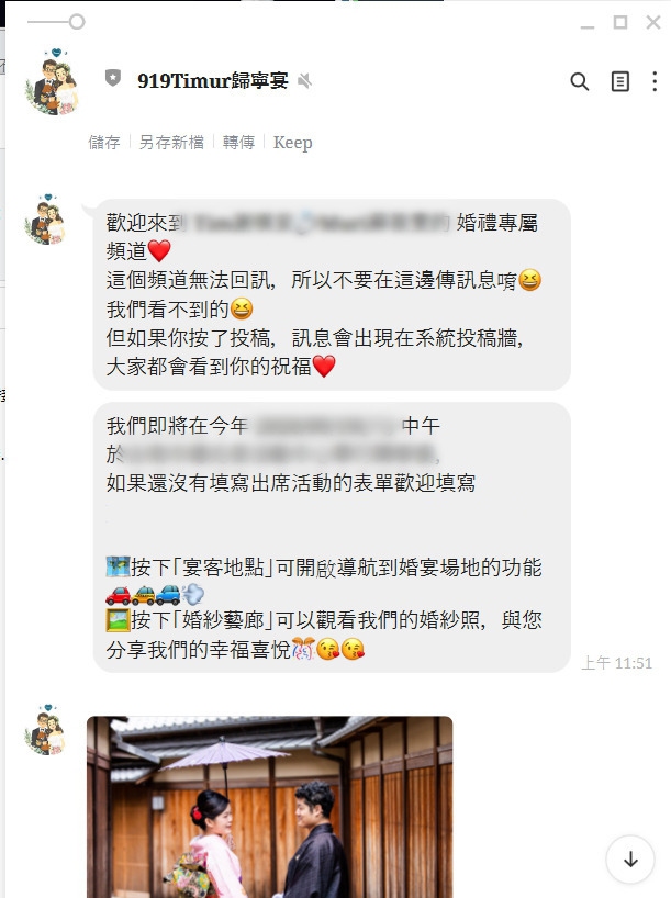 拍拍印的功能比我預期的要多太多了~他們有一個電子喜帖的功能可以事先作出席調查、可以發推播通知,統一發佈賓客地圖、時間地點、注意事項,每個月可發的訊息量雖然有上限但其實我發不到那麼多,如果婚期還有幾個月的新娘真的相對划算很多!推播訊息可發圖片、影片、文字,我覺得在婚前發行前通知超好用! 不用一個一個通知賓客怕漏掉,而且幾乎大部分的人都可以用LINE聯絡。