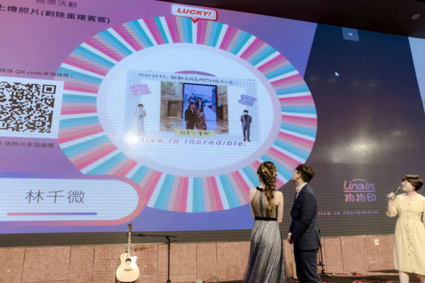 幸好有拍拍印,在我們婚禮拖延、婚宴延後接近一小時才開始的窘境下,拍拍印也讓賓客們可以打發等待的時間XD 為了讓賓客們可以更踴躍的使用拍拍印,我們除了安排上菜前不斷的撥放拍拍印的使用教學影片(拍拍印預備的),也請婚宴主持人三不五時就上台提醒一下大家,同時也安排了兩次抽獎活動,只要使用拍拍印就有抽獎資格。