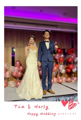 - 現場布置: 在現場的布置真的很可愛,我最喜歡相片樹,工作人員會幫忙印個30張婚紗照出來,讓親友們在背面留言,另外也提供了道具讓大家拍照使用。現場的東西一應俱全,但是擺放整齊不雜亂