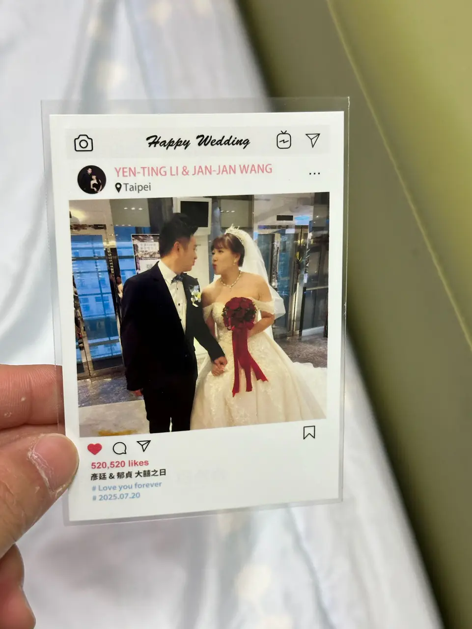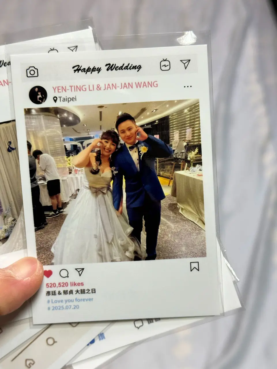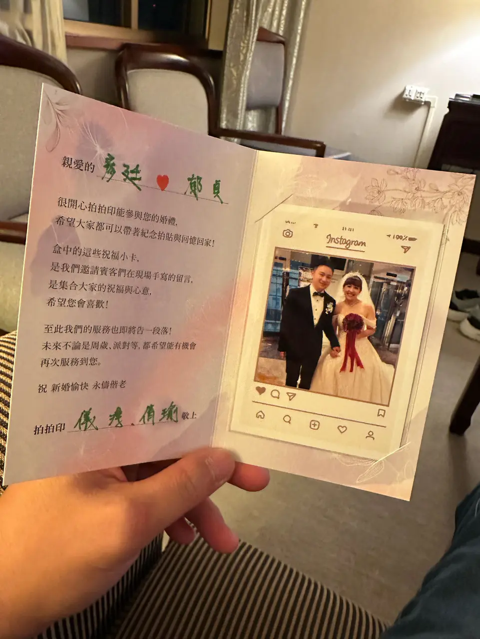 兩年前參加朋友婚禮時首次接觸拍拍印,覺得不只是吃飯聚會,還能把當下的歡樂印成照片帶回家,非常有紀念價值。這次輪到我結婚,第一個想到的就是一定要租拍拍印!我選擇了兩台機台的方案,現場工作人員非常親切,主動協助賓客拍照、引導使用,也幫我們留下許多珍貴畫面。最讓我感動的是他們還特別寫了卡片給我們,充滿溫度和祝福。整體體驗非常棒,如果身邊有朋友準備結婚,我一定會大力推薦拍拍印!
