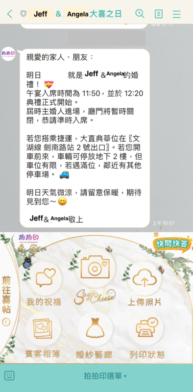 婚禮於二月底圓滿落幕,誠心推薦拍拍印是籌備婚禮的好幫手! 首先,我們使用專屬新人「 Line官方