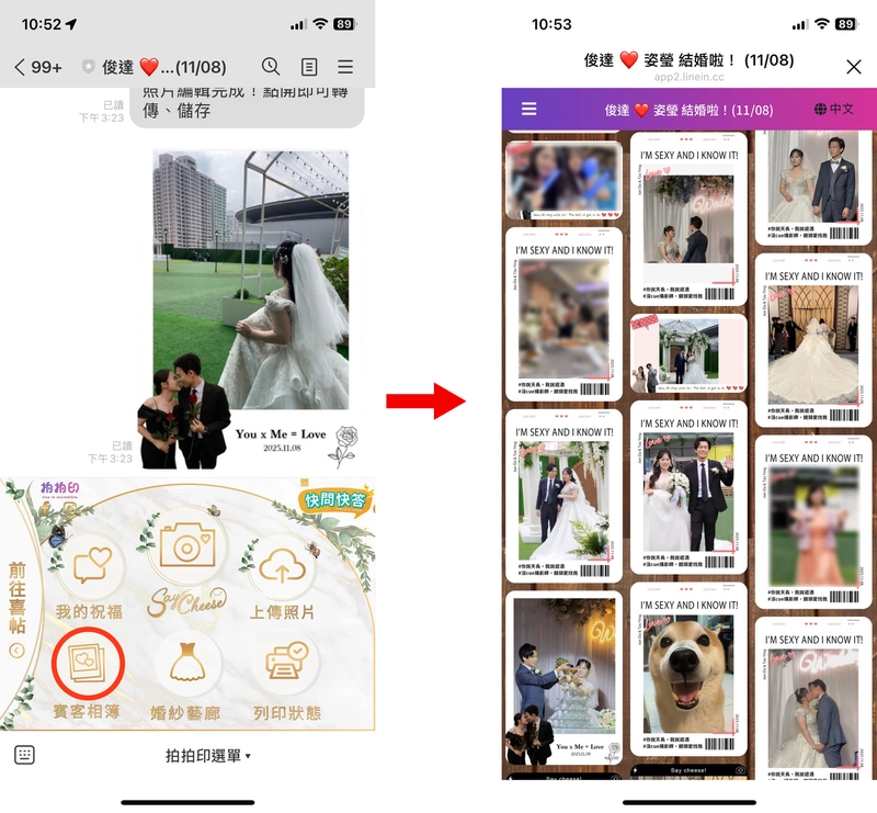 最重要的部分是:婚禮當天忙到沒辦法操作拍拍印的時候,很多賓客都會拍照紀錄婚宴時每個幸福畫面,也會把照片上傳列印,還可以留下祝福給新人,這個真的超讚的!