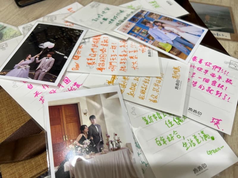 機台印製的婚紗小卡後面也有好友的留言祝福🥰看了心裡暖暖的,而且因為有這些小卡,我們也不用額外花錢去印來擺在收禮桌(重點是小卡還有很多選擇,不會固定只有一兩種)🫶🏻每張印出來的相片都會用透明套裝好~不怕污損,很貼心!