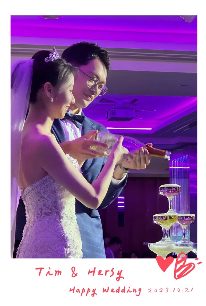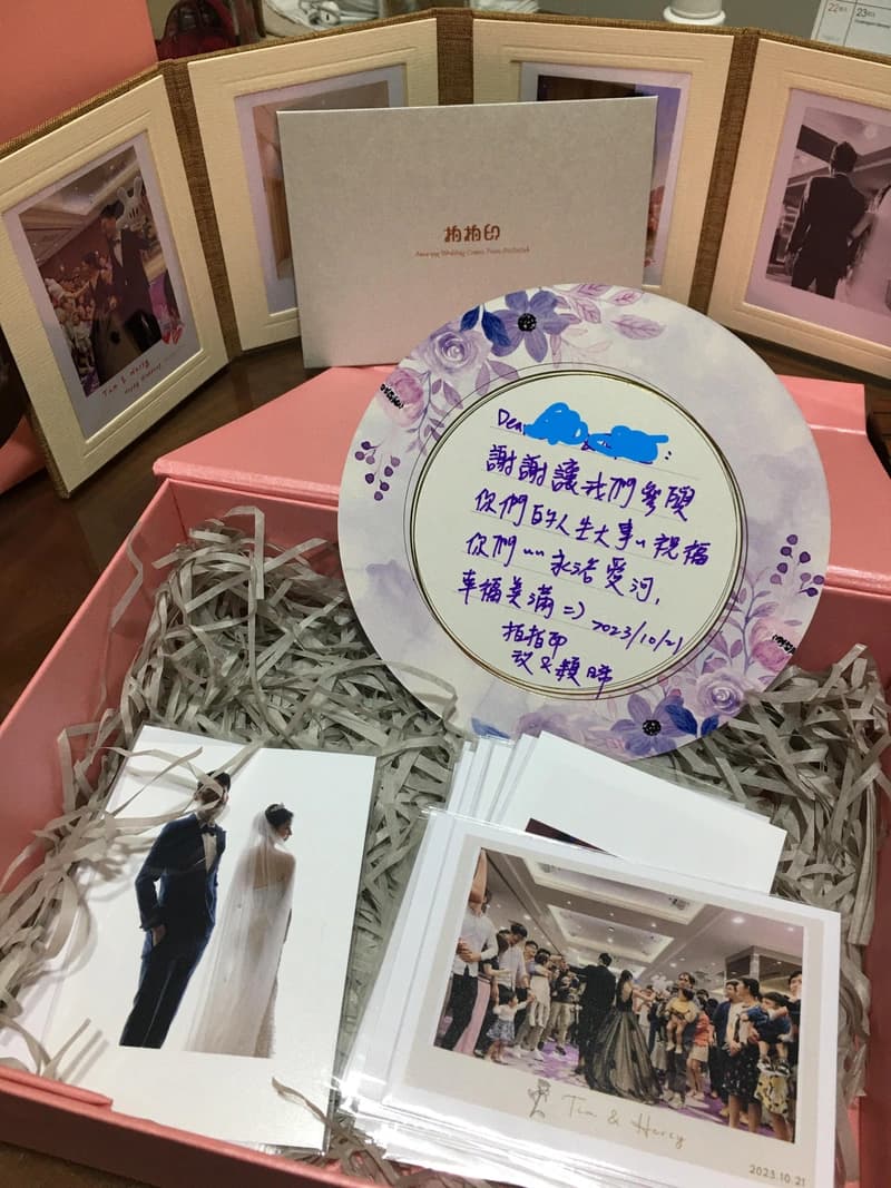 禮盒: 婚禮結束時,我們得到了一個拍拍印禮盒,裡面裝著工作人員幫我們印的現場照片、賓客留言的照片,還有工作人員給我們的祝福